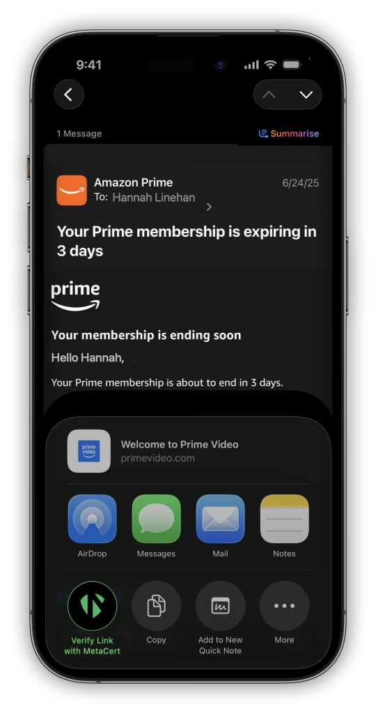 That’s why we partnered with MetaCert. Their Link Verifier introduces the first Zero Trust security model for mobile. One simple API integration that protects people across every digital channel including text messages, browsers, QR codes, email, and in-app links. It prevents dangerous links from tricking people and allows instant confirmation of whether a website or request is verified as legitimate.